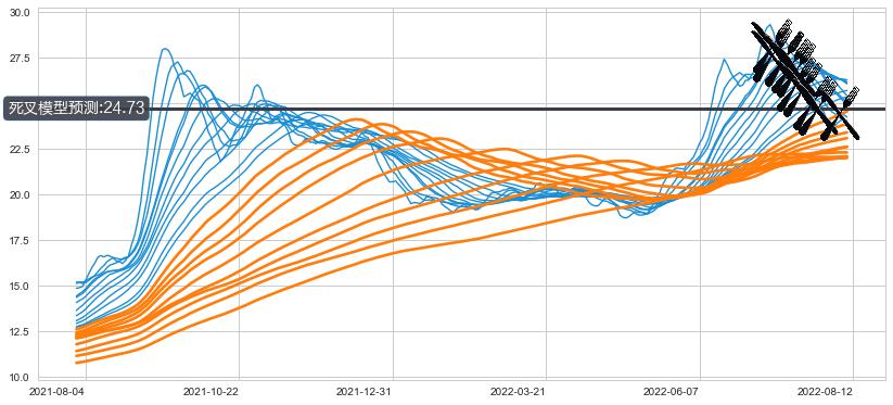 ➣ 21小时均线于(2022-07-14: 27.39)形成【死叉】基于【死叉历史模型】预测死叉后最低波谷价格: 26.55, 死叉后最低价格23.20,已经下跌超出预测最低波谷价格, 预期反弹