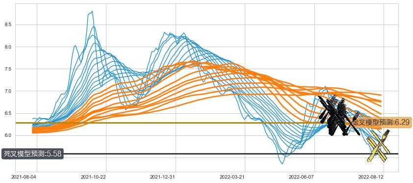 ➢ 90小时均线于(2022-06-29: 6.42)形成【死叉】基于【死叉历史模型】预测死叉后最低波谷价格: 5.81, 死叉后最低价格5.40,已经下跌超出预测最低波谷价格, 预期反弹