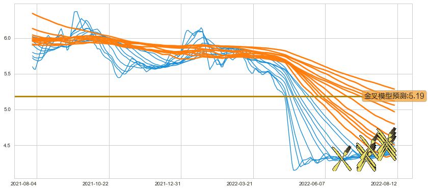 ➢ 90小时均线于(2022-08-04: 4.56)形成【金叉】基于【金叉历史模型】预测金叉后最高波峰价格: 5.54, 金叉后最高价格4.68,尚未达到预测最高波峰价格, 预期继续上涨