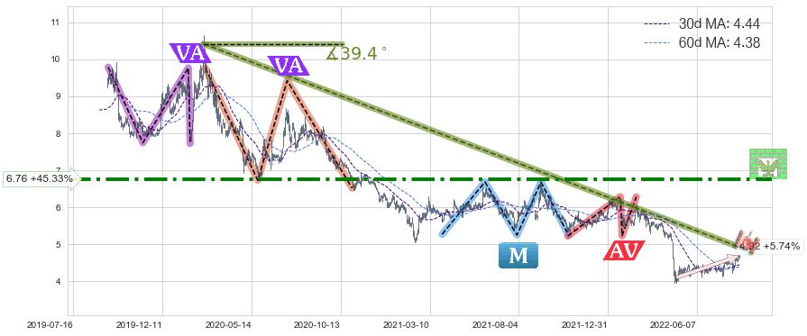 ➢ 【已达成】最小【整理】第一目标价格→(2022-04-26: 4.47 ), 后续继续【整理】下跌动力依然存在,下跌空间适中