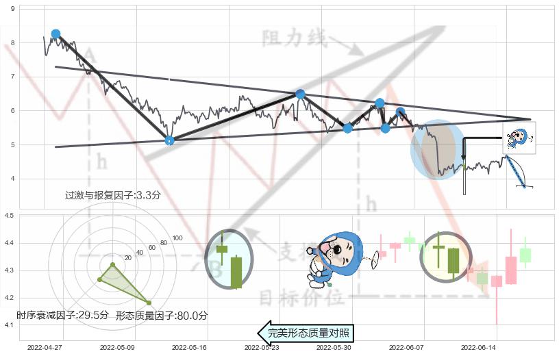 ➣ 【多空双方观望→争持→促使价格波动日益狭窄→空方打破攻守平衡点】对称三角形中继整理, 已在2022-03-15突破【支撑】颈线 5.54 →演变成下降通道