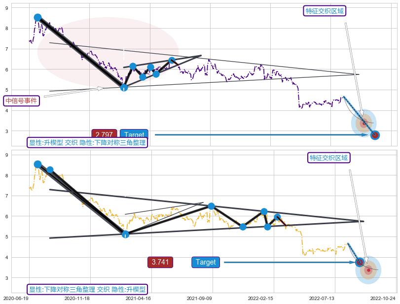 ➣ 上涨螺旋桨形态 + 下降对称三角整理临近target支撑拐点上涨信号叠加后【目标达成率】中等,【看多】信号叠加【存续影响中等】
