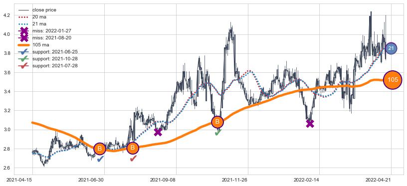 ➣ 21小时均线于(2022-06-20: 3.821)形成【死叉】基于【死叉历史模型】预测死叉后最低波谷价格: 3.462, 死叉后最低价格3.260,已经下跌超出预测最低波谷价格, 预期反弹