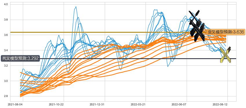 ➣ 34小时均线于(2022-06-22: 3.679)形成【死叉】基于【死叉历史模型】预测死叉后最低波谷价格: 3.360, 死叉后最低价格3.260,已经下跌超出预测最低波谷价格, 预期反弹
