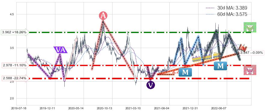 ♘ 阻力价格位3.962,可信任强度77.83%,距离最后交易2022-08-12形成的收盘价格3.350相差 +18.26%