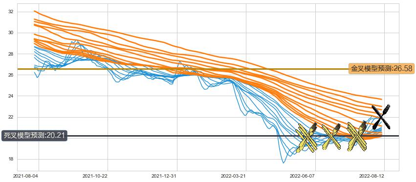 ➢ 10小时均线于(2022-08-11: 22.00)形成【死叉】基于【死叉历史模型】预测死叉后最低波谷价格: 20.28, 死叉后最低价格21.84,尚未达到预测最低波谷价格, 预期继续下跌