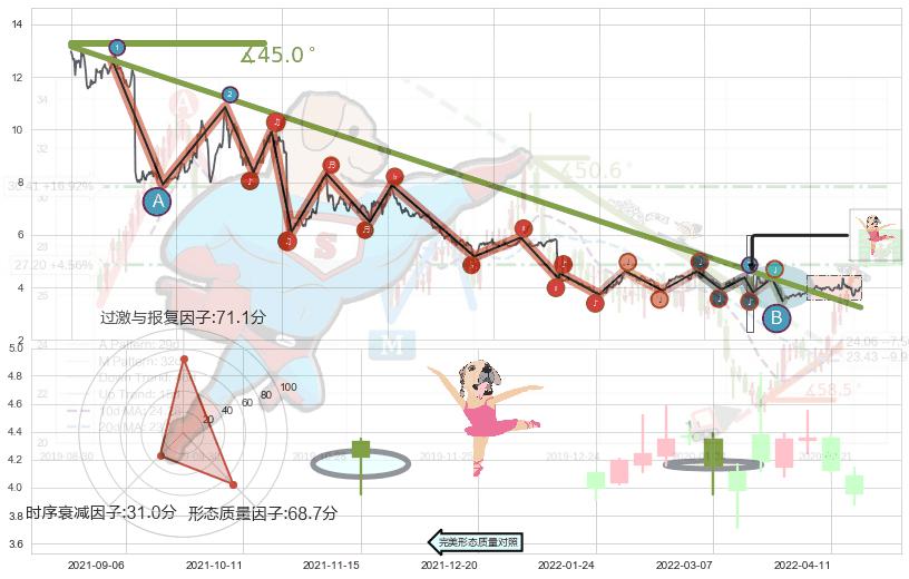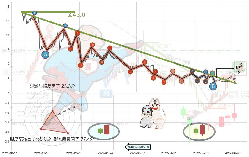 从2019-07-16至2022-06-14,共包含706个交易日,阶段股价下跌-87.59%,阶段股价变动位移路程比: 1 : 12,下跌趋势角度: 45.0,2019-10-17向↘︎形成缺口,跳空下跌-30.20%˚