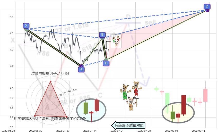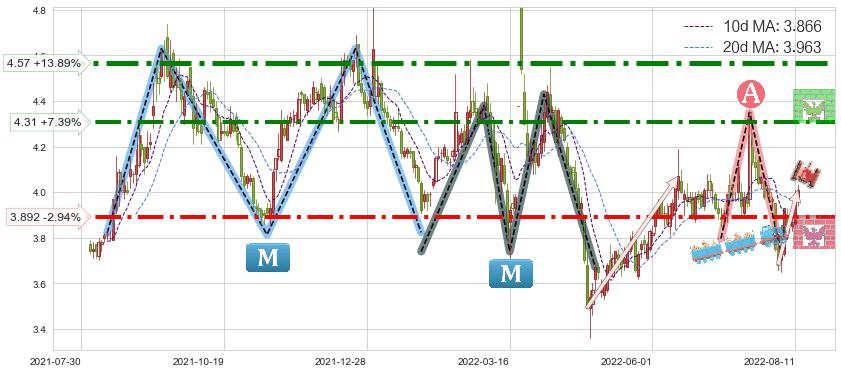 ♘ 阻力价格位4.31,可信任强度75.46%,距离最后交易2022-08-12形成的收盘价格4.01相差 +7.39%