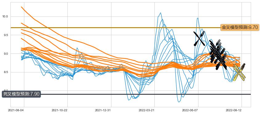 ➢ 10小时均线于(2022-06-08: 9.40)形成【死叉】基于【死叉历史模型】预测死叉后最低波谷价格: 8.94, 死叉后最低价格8.18,已经下跌超出预测最低波谷价格, 预期反弹