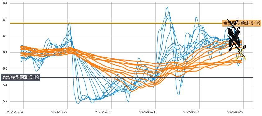 ➣ 21小时均线于(2022-08-01: 6.01)形成【死叉】基于【死叉历史模型】预测死叉后最低波谷价格: 5.64, 死叉后最低价格5.53,已经下跌超出预测最低波谷价格, 预期反弹