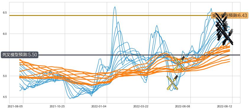 ➣ 34小时均线于(2022-07-29: 6.12)形成【死叉】基于【死叉历史模型】预测死叉后最低波谷价格: 5.71, 死叉后最低价格5.50,已经下跌超出预测最低波谷价格, 预期反弹