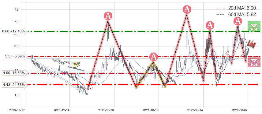 ♘ 支撑价格位4.90,可信任强度55.80%,距离最后交易2022-08-12形成的收盘价格5.89相差 -16.85%