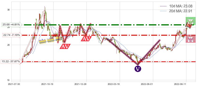 ♘ 阻力价格位25.68,可信任强度91.40%,距离最后交易2022-08-12形成的收盘价格24.50相差 +4.81%