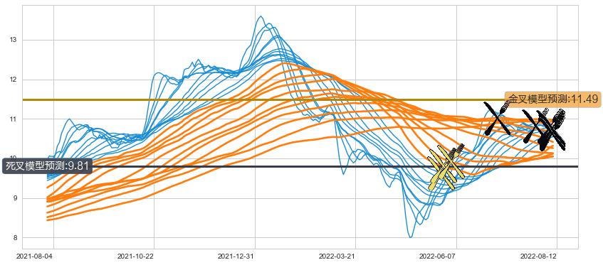 ➢ 55小时均线于(2022-08-11: 10.61)形成【死叉】基于【死叉历史模型】预测死叉后最低波谷价格: 9.20, 死叉后最低价格10.63,已经下跌超出预测最低波谷价格, 预期反弹
