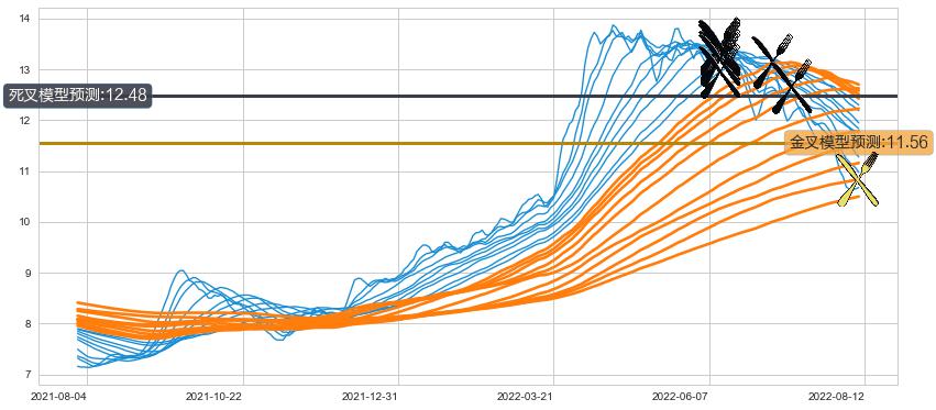 ➣ 90小时均线于(2022-07-13: 12.64)形成【死叉】基于【死叉历史模型】预测死叉后最低波谷价格: 11.84, 死叉后最低价格10.54,已经下跌超出预测最低波谷价格, 预期反弹
