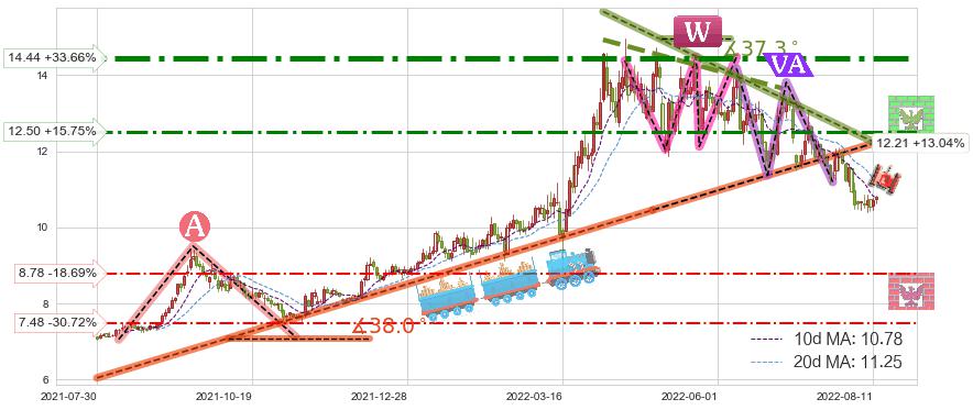 ♘ 阻力价格位14.44,可信任强度96.41%,距离最后交易2022-08-12形成的收盘价格10.80相差 +33.66%