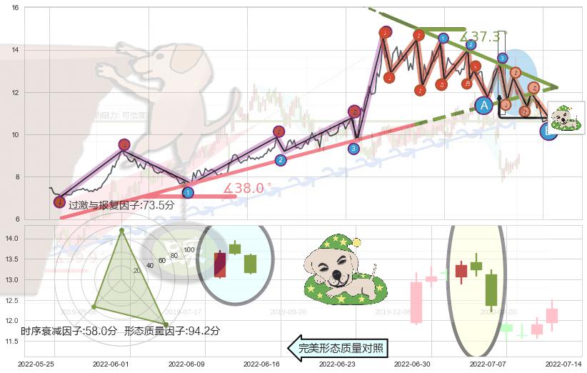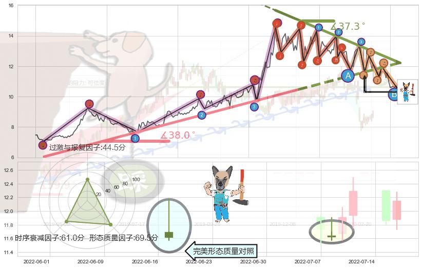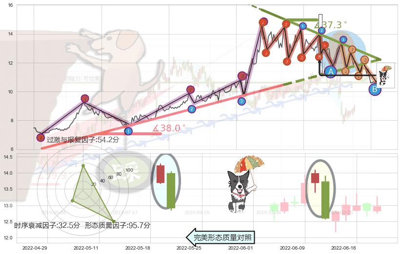 ➣ 2021-07-30-2022-04-28上升趋势存在反转[风险],其原上升趋势的支撑位(12.23)已破位[强阻力信号],原上升趋势角度: 38.0˚