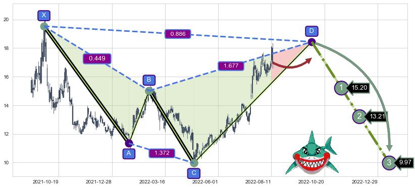 ➣ 未完成【鲨鱼】形态起点X: 2021-09-22, 已到达C点: 2022-04-26, 预测最终D点: 2022-10-04, 共252交易日