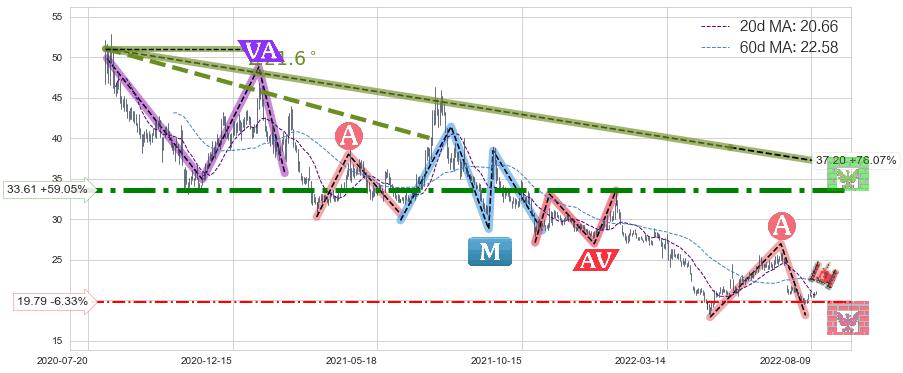 ♘ 支撑价格位19.79,可信任强度54.42%,距离最后交易2022-08-12形成的收盘价格21.13相差 -6.33%