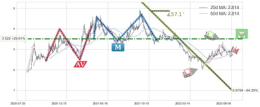 ♘ 阻力价格位3.522,可信任强度68.20%,距离最后交易2022-08-12形成的收盘价格2.730相差 +29.01%