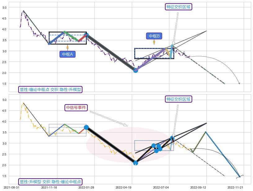 ➣ 缠论中枢点:猜想破位中枢B后持续下拉 → 下跌 → 破位中枢B支撑 → 持续趋势跟踪