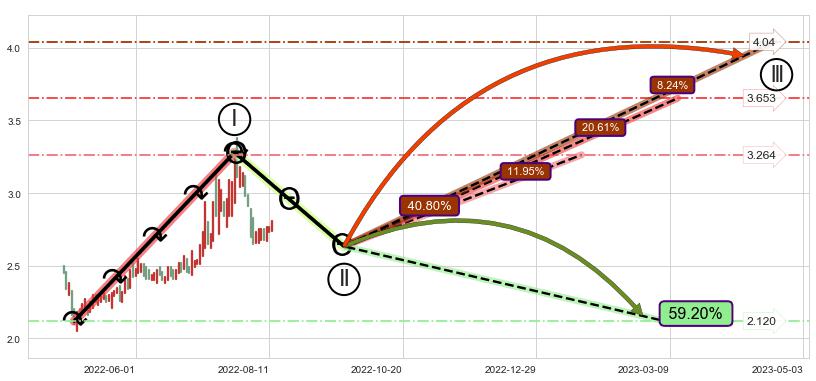 ➢ 循环浪继续向上【最低】位置(2023-01-23, 3.264),匹配聚类样本比例29.30%, 可能性概率11.95%