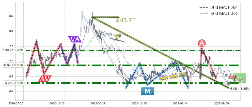 ♘ 阻力价格位7.36,可信任强度68.21%,距离最后交易2022-08-12形成的收盘价格6.33相差 +16.29%