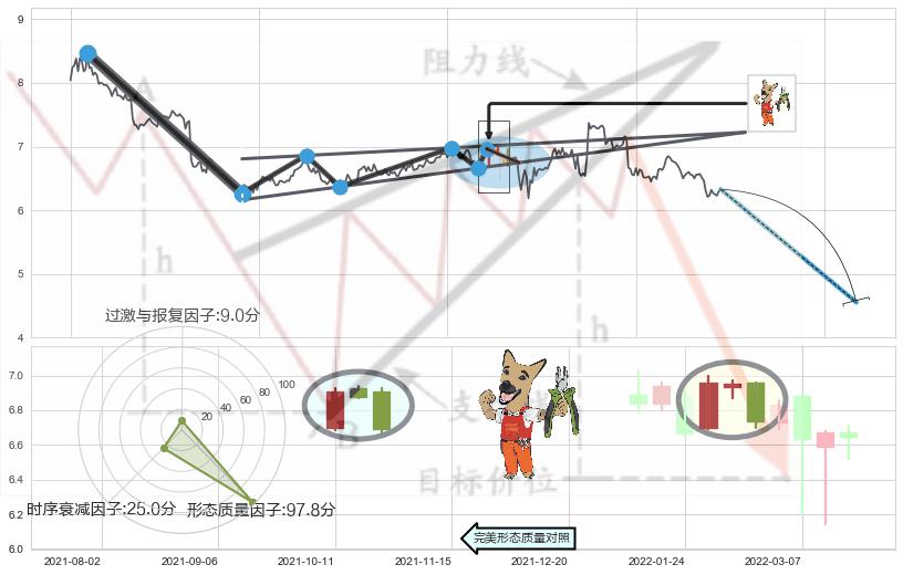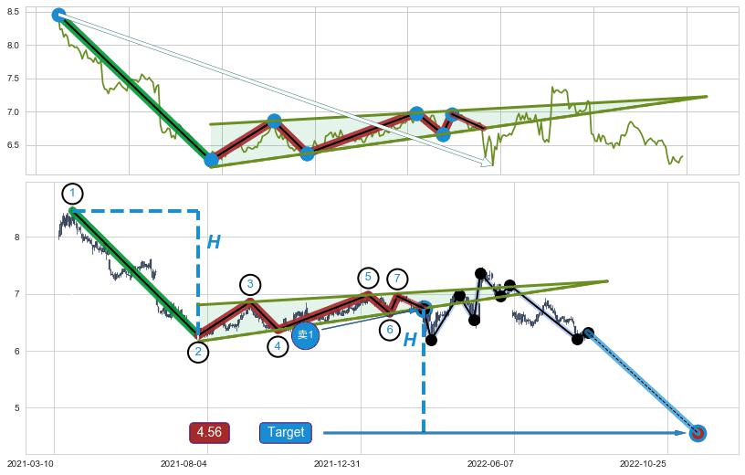 ➢ 【卖1】: 激进型 卖点→(2022-03-08: 6.75 )形成突破升🚩楔型【整理】形态