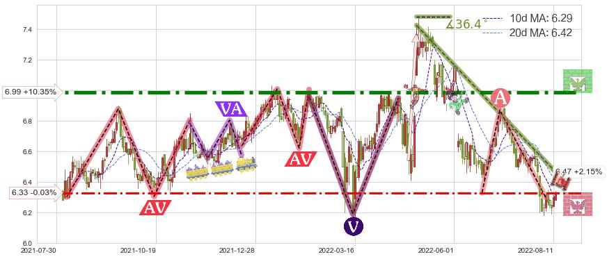 ♘ 阻力价格位6.99,可信任强度94.01%,距离最后交易2022-08-12形成的收盘价格6.33相差 +10.35%