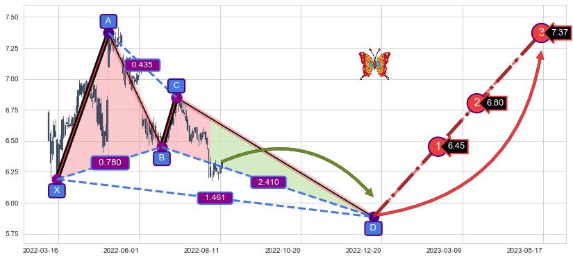 ➢ 未完成【蝴蝶】形态起点X: 2022-03-15, 已到达C点: 2022-07-05, 预测最终D点: 2022-12-22, 共190交易日