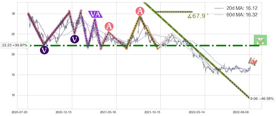 ♘ 阻力价格位22.23,可信任强度96.59%,距离最后交易2022-08-12形成的收盘价格16.97相差 +30.97%