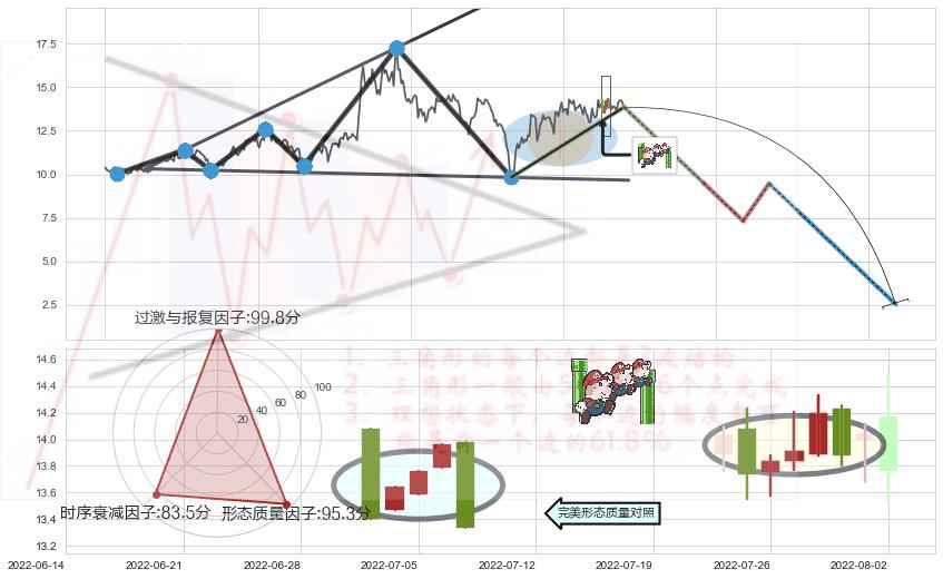 ➢ 下跌镊子线(n形磁铁) + 扩散三角反转临近支撑猜想转换阻力下跌信号叠加后【反向回撤率】中等,【看空】信号叠加【存续影响中等】