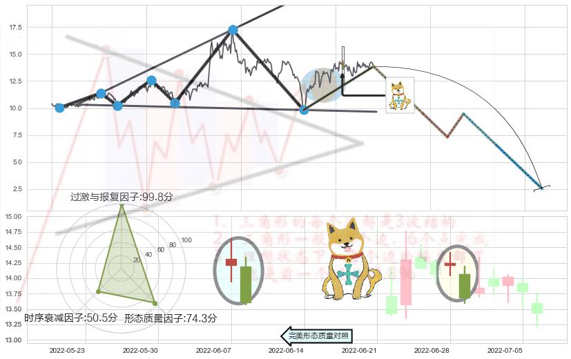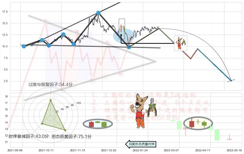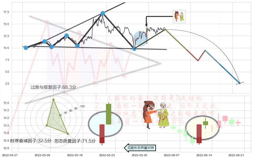 ➢ 下降三部曲(降势三鹤) + 扩散三角反转临近支撑猜想转换阻力下跌信号叠加后【反向回撤率】中等,【看空】信号叠加【存续影响中等】