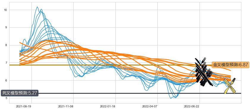 ➢ 30小时均线于(2022-06-24: 6.44)形成【死叉】基于【死叉历史模型】预测死叉后最低波谷价格: 5.65, 死叉后最低价格5.47,已经下跌超出预测最低波谷价格, 预期反弹
