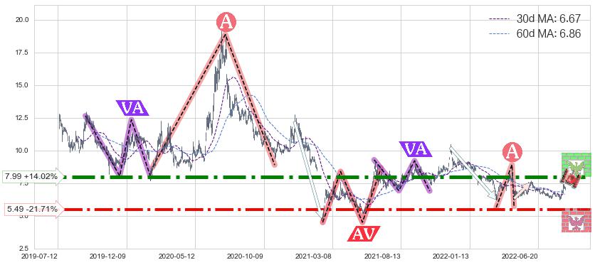 ♘ 阻力价格位7.99,可信任强度91.33%,距离最后交易2022-08-12形成的收盘价格7.01相差 +14.02%