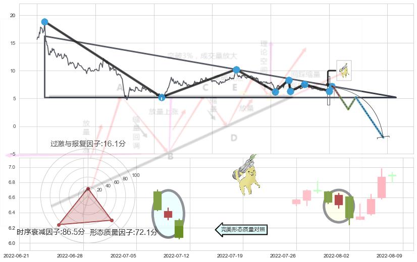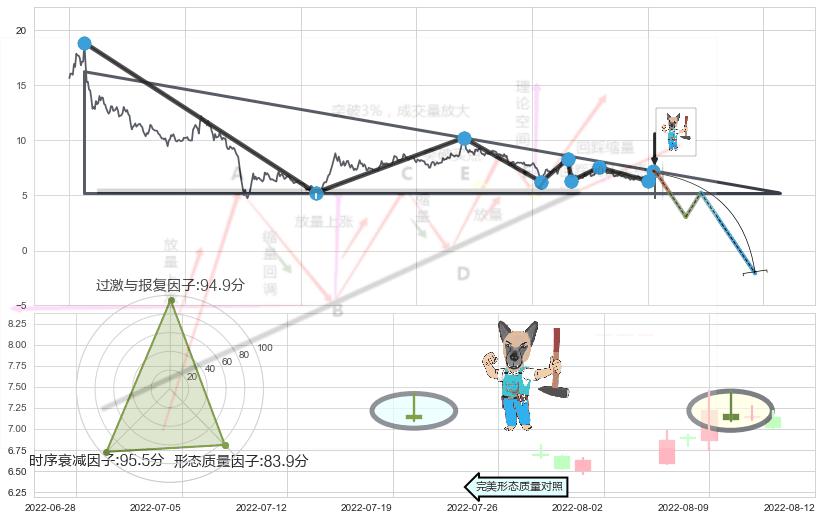 ➢ AI智能: 预测【多空防线逐步靠近→双方接火→空方占优】下降三角形中继整理向下突破,预测将在2022-08-29突破颈线, 演变成下降通道