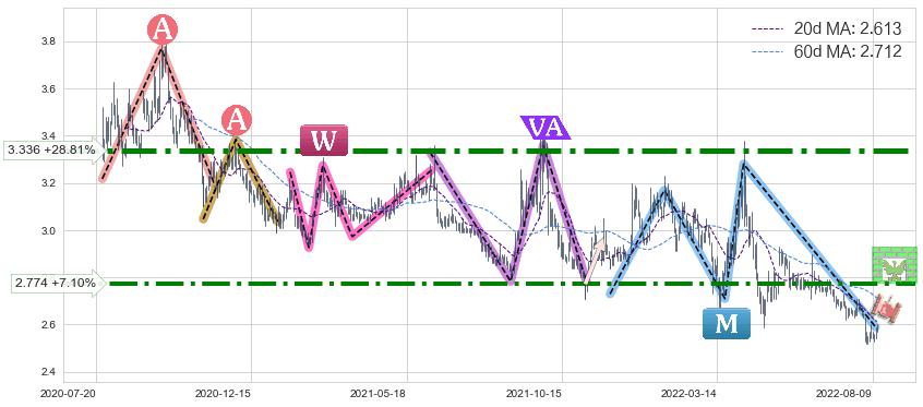 ♘ 阻力价格位2.774,可信任强度80.36%,距离最后交易2022-08-12形成的收盘价格2.590相差 +7.10%
