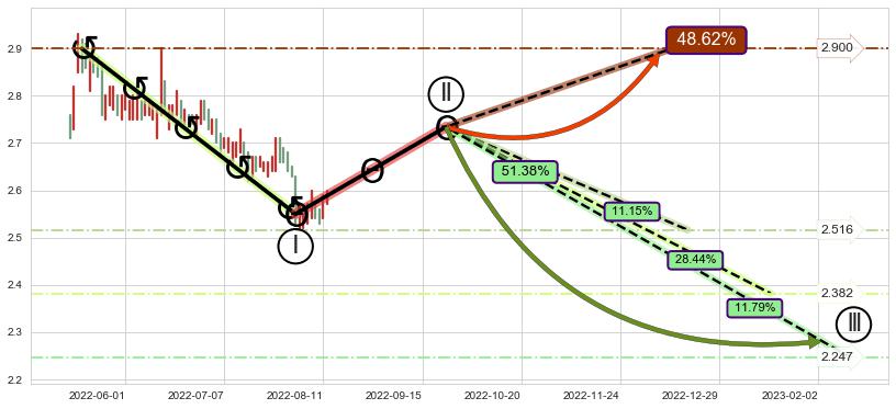 ➢ 循环浪继续向下【最低】位置(2023-02-14, 2.247),匹配聚类样本比例22.94%, 可能性概率11.79%