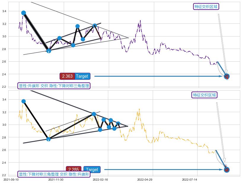 ➢ 下降对称三角整理:猜想预期下跌目标target即将达成,随后猜想强支撑来临,预期反弹上涨(均值回复)