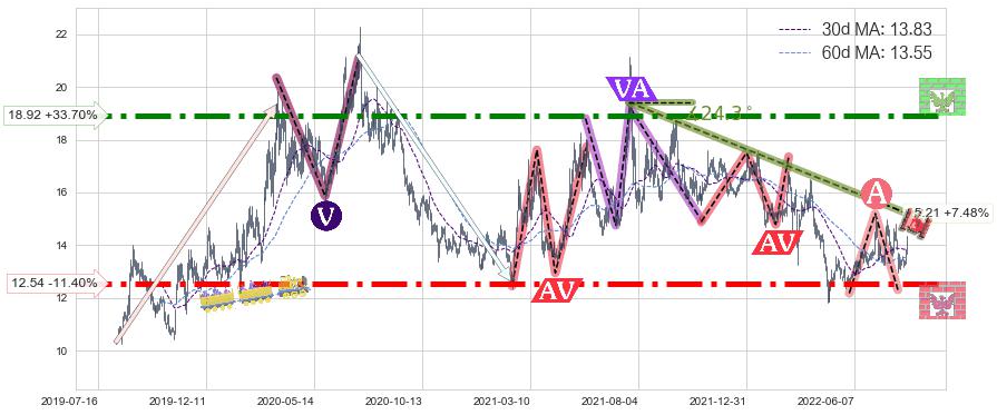 ♘ 阻力价格位18.92,可信任强度92.39%,距离最后交易2022-08-12形成的收盘价格14.15相差 +33.70%