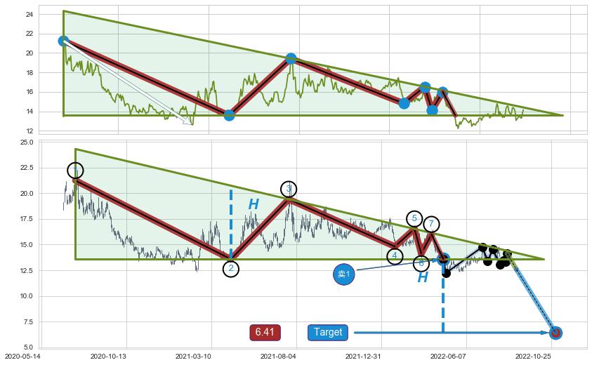 ➣ 【未确认突破,预测即将形成突破】下降【对称】三角形整理起点:2021-11-26, 预测突破点:2022-08-19,形态共179交易日