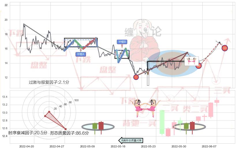 ➣ 【中枢B】:2022-03-09-2022-04-08,中枢由5笔构成,共21交易日, ZG=15.78, ZD=15.11