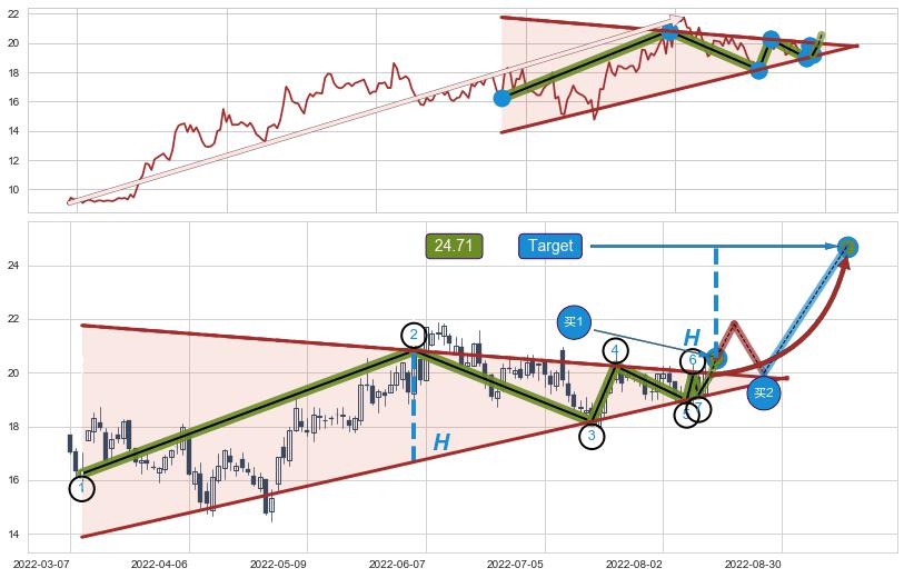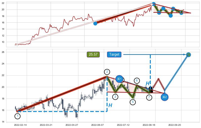 ➢ 最小中继整理涨幅→𝐇: 6.00 (𝐇楔型旗杆的长度:楔型起点→顶点)
