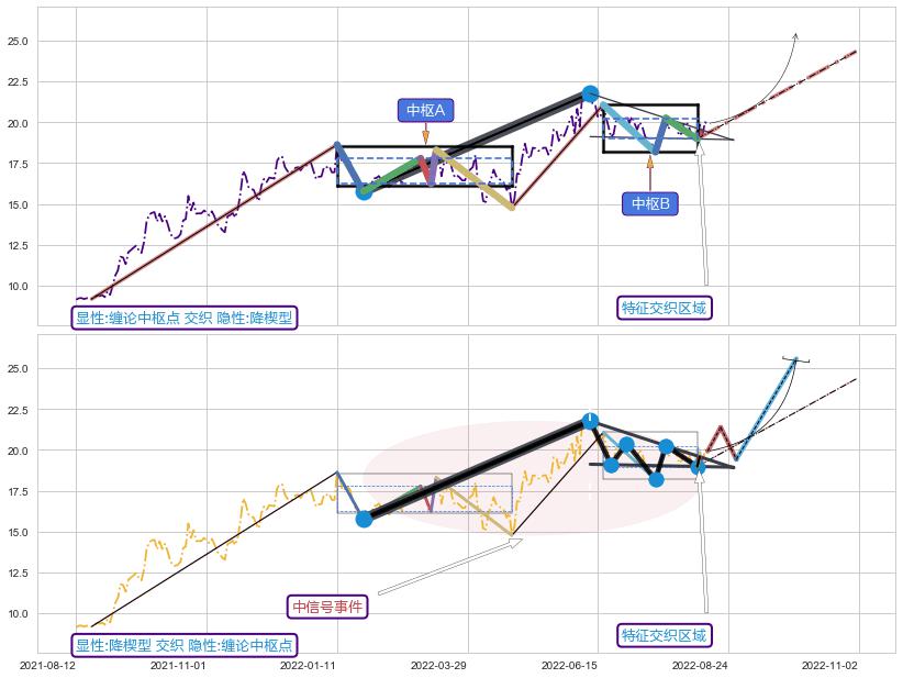 ➣ 缠论中枢点:猜想突破中枢B后持续拉升 → 上涨 → 突破中枢B阻力 → 持续趋势跟踪