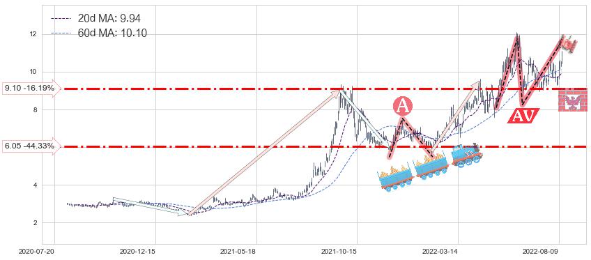 ♘ 支撑价格位9.10,可信任强度59.74%,距离最后交易2022-08-12形成的收盘价格10.86相差 -16.19%
