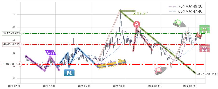 ♘ 支撑价格位46.43,可信任强度62.59%,距离最后交易2022-08-12形成的收盘价格50.51相差 -8.09%