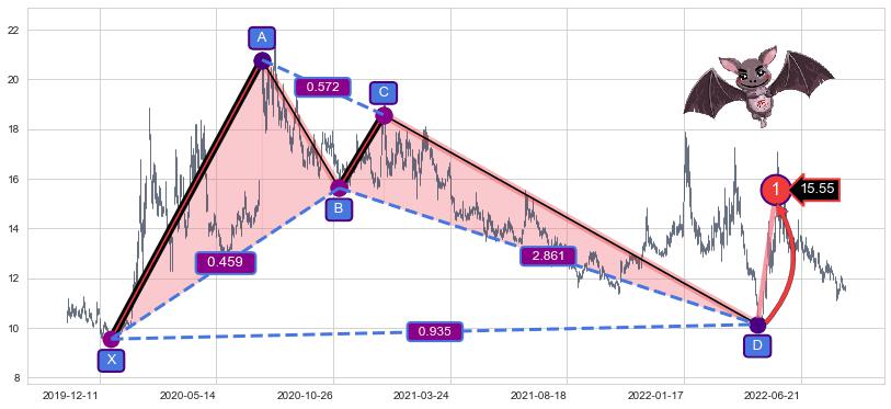 ➣ 已完成【蝙蝠】形态起点X: 2019-12-25, 终点D: 2022-04-25, 共554交易日