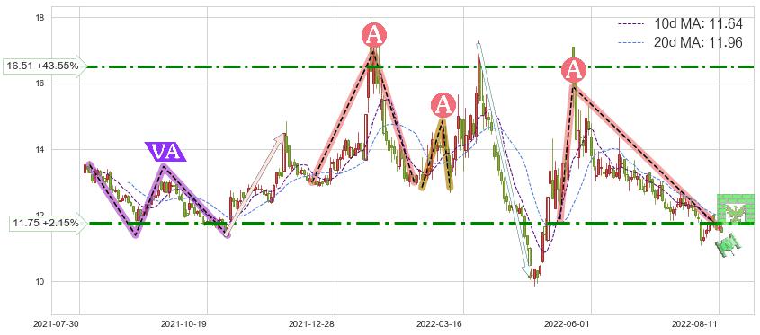 ♘ 阻力价格位11.75,可信任强度74.08%,距离最后交易2022-08-12形成的收盘价格11.50相差 +2.15%