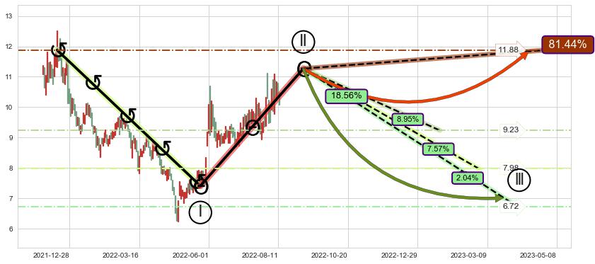 ➣ 循环浪继续向下【平均值】位置(2023-03-01, 7.98),匹配聚类样本比例40.81%, 可能性概率7.57%