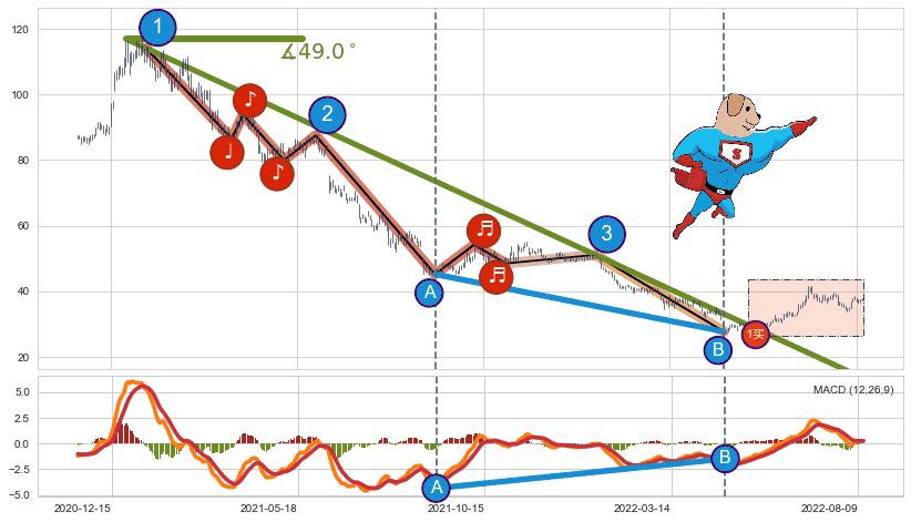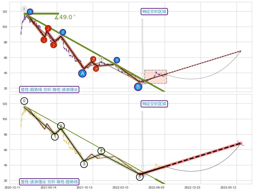从2020-12-25至2021-11-15,共包含214个交易日,阶段股价下跌-69.54%,阶段股价变动位移路程比: 1 : 5,下跌趋势角度: 54.0